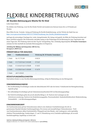 Seit Oktober 2014 werden auch jene Eltern von der Stadt Graz gefördert, die ihre Kinder stundenweise und flexibel betreuen lassen. Die Förderhöhen sind analog jener Förderung bei der Betreuung durch Tagesmütter/väter. Die Förderung geht auf die Einkommenssituation der Eltern ein.